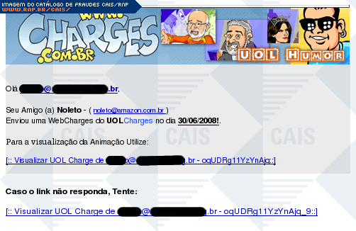 comentário Mais uma mensagem que alega trazer uma animação do popular site de charges Charges,com.br. O usuário é levado a copiar um software malicioso, o cavalo de tróia Trojan.Crypt.Delf.Y (Ikarus).
