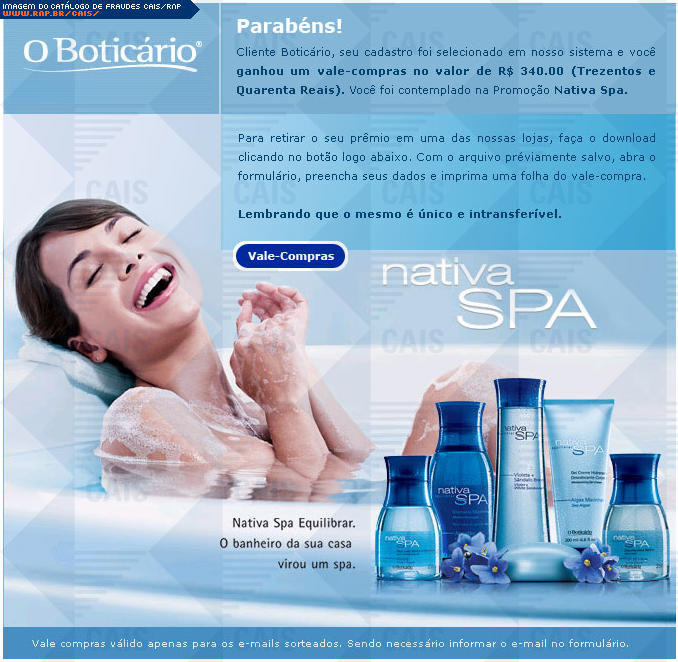 assunto "Voce Ganhou - Vale Compra Boticario / Boticario" ou "Voce ganhou um Vale-Compra"
