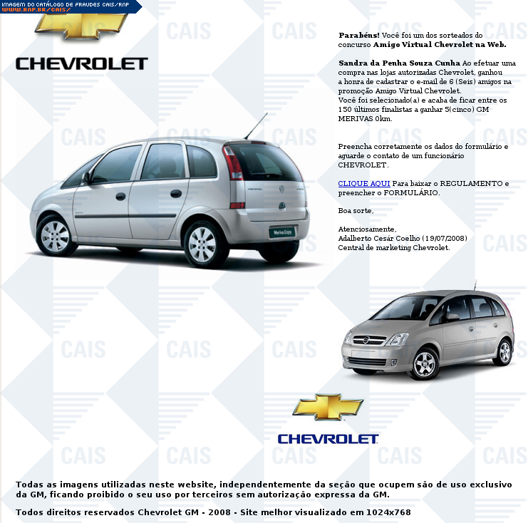 comentário Esta mensagem informa o leitor que ele foi sorteado no concurso "Amigo Virtual Chevrolet na Web", da Chevrolet GM, O link que supostamente leva ao texto do regulamento e a um formulário, que na realidade leva a um software malicioso. Observações: (1) a Chevrolet... (leia mais)