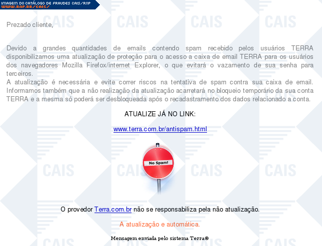 Esta página tem função informativa e educativa. Exibe uma coleção de imagens de phishing scam (fraudes eletrônicas) ou malware (código malicioso) veiculados por meio de spam (e-mail não-solicitado). Trata-se de conteúdo exemplificativo, não exaustivo, uma vez que não é possível contemplar todos os casos de fraudes existentes. Assim, caso você tenha conhecimento de um exemplar que não esteja aqui presente, isto não significa que não seja válido ou real. Inclusive incentivamos que você o envie para análise do CAIS para que, se for o caso, passe a integrar o nosso acervo.