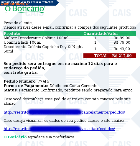 comentário Fraude relativamente sofisticada, envolvendo uma mensagem e um site com domínio próprio registrado no Registro.br, muito semelhante aos domínios reais da empresa. A mensagem traz uma relação de produtos O Boticário, que serão pagos por débito automático.... (leia mais)