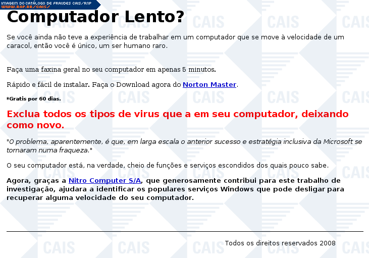 comentário Esta mensagem, com texto muito mal elaborado, tenta convencer o usuário a copiar o software Symantec Norton Master, que vai tornar seu computador muito mais rápido, entre outras promessas fantásticas. A generosa empresa Nitro Computer S/A aparentemente não... (leia mais)