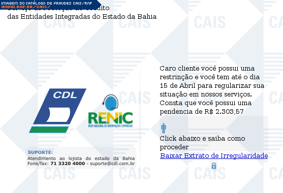 comentário Mensagem que traz informações sobre uma suposta restrição no Serviço de Proteção ao Crédito (SPC) das Entidades Integradas do Estado da Bahia. O usuário é levado a copiar o software malicioso Trojan-Downloader.Win32.Banload.zaaa (F-Secure).