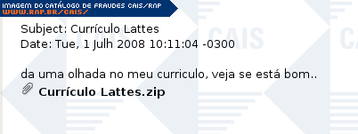 comentário Esta mensagem aborda um tema mais acadêmico, talvez uma tentativa de convencer mais facilmente usuários com e-mail que tem domínios de universidades. A mensagem traz, em texto bem simples, um suposto currículo da Plataforma Lattes (lattes.cnpq.br), do CNPQ/MCT.... (leia mais)