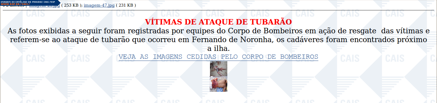 | comentário | A mensagem contém links para supostas fotos, que teriam sido cedidas pelo corpo de bombeiros, de vítimas de ataques de tubarão. Os links levam ao arquivo malicioso identificado como HEUR:Trojan.Win32.Generic (Kaspersky). | |