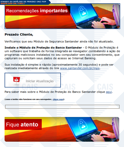 Esta página tem função informativa e educativa. Exibe uma coleção de imagens de phishing scam (fraudes eletrônicas) ou malware (código malicioso) veiculados por meio de spam (e-mail não-solicitado). Trata-se de conteúdo exemplificativo, não exaustivo, uma vez que não é possível contemplar todos os casos de fraudes existentes. Assim, caso você tenha conhecimento de um exemplar que não esteja aqui presente, isto não significa que não seja válido ou real. Inclusive incentivamos que você o envie para análise do CAIS para que, se for o caso, passe a integrar o nosso acervo.