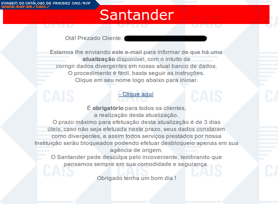 | comentário | A mensagem, em nome do banco Santander, informa que a vítima deve realizar uma atualização obrigatória. O link para a suposta atualização leva a uma página falsa, destianda a roubar dados da conta bancária da vítima. | |