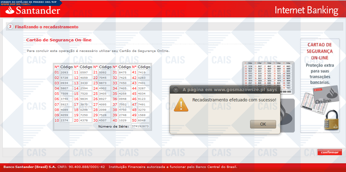 | comentário | A mensagem, em nome do Grupo Santander, infoma que a vítima deve atualizar o módulo de segurança. A mensagem ainda explica a função do módulo de proteção e fornece um link para sua instalação. O link leva a uma página falsa destinada a coletar dados da conta... (leia mais) | |