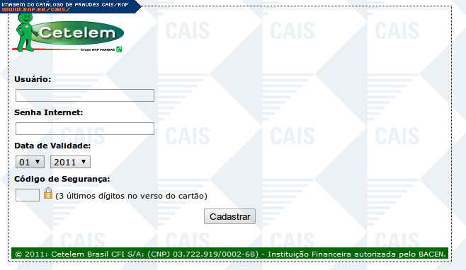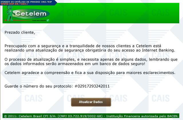 | comentário | A mensagem, em nome da Cetelem, informa que a vítima deve realizar a atualização dos seus dados. O link para a suposta atualização leva a uma página falsa, destinada a coletar informações confidenciais da vítima. | |
