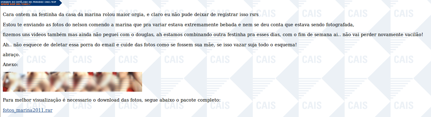 | comentário | A mensagem, que teria sido enviada por uma amigo da vítima, contém um link para supostas fotos de uma orgia, que teria acontacido em uma festa. O link leva ao arquivo malicioso identificado como Trojan.Win32.Buzus.hqoc (Kaspersky). | |