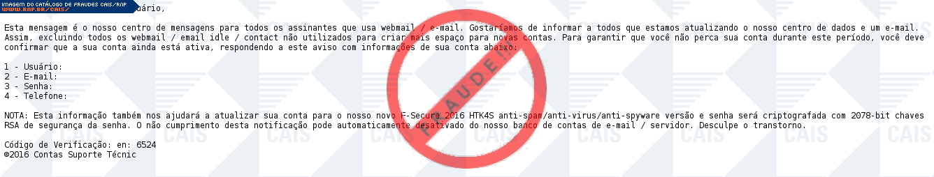 | comentário | A vítima recebe uma mensagem dizendo que seu email poderá ser desativado caso não responda a mensagem com informações de sua conta. Este tipo de email é falso e tenta roubar informações das contas das vítimas. | |