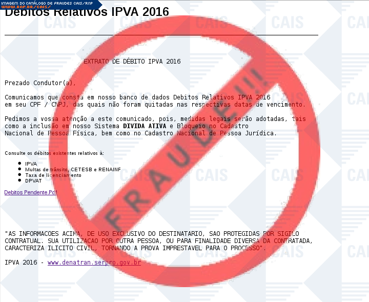 Esta página tem função informativa e educativa. Exibe uma coleção de imagens de phishing scam (fraudes eletrônicas) ou malware (código malicioso) veiculados por meio de spam (e-mail não-solicitado). Trata-se de conteúdo exemplificativo, não exaustivo, uma vez que não é possível contemplar todos os casos de fraudes existentes. Assim, caso você tenha conhecimento de um exemplar que não esteja aqui presente, isto não significa que não seja válido ou real. Inclusive incentivamos que você o envie para análise do CAIS para que, se for o caso, passe a integrar o nosso acervo.