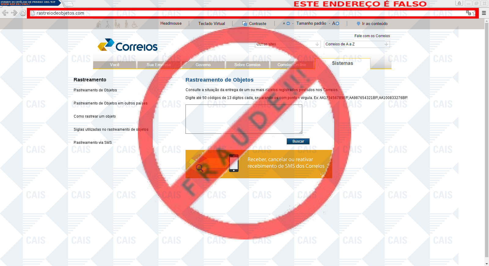 | tipo | FRAUDE - Correios - Consulta/ Rastreio | ID: 47611 |
