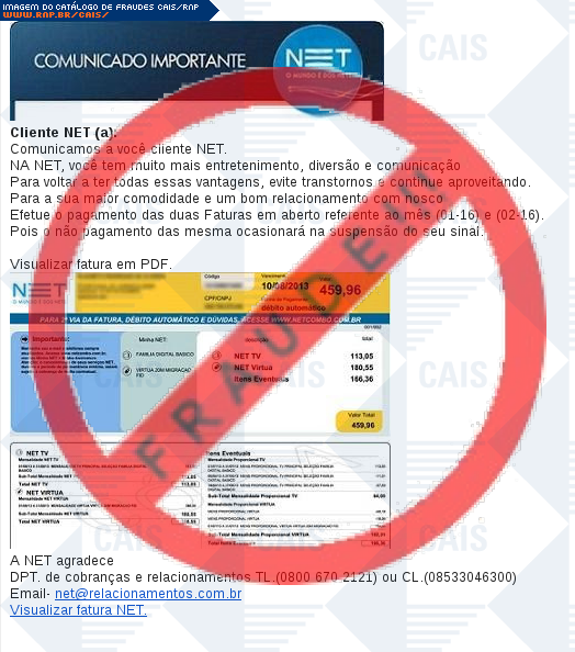 | comentário | O usuário recebe uma mensagem contendo uma fatura da provedora NET disponível para download, no entanto o arquivo originado é malicioso criado para roubar informações da vítima e instalar outros arquivos fraudulentos com o nome de Trojan.Win32.Generic!BT. | |