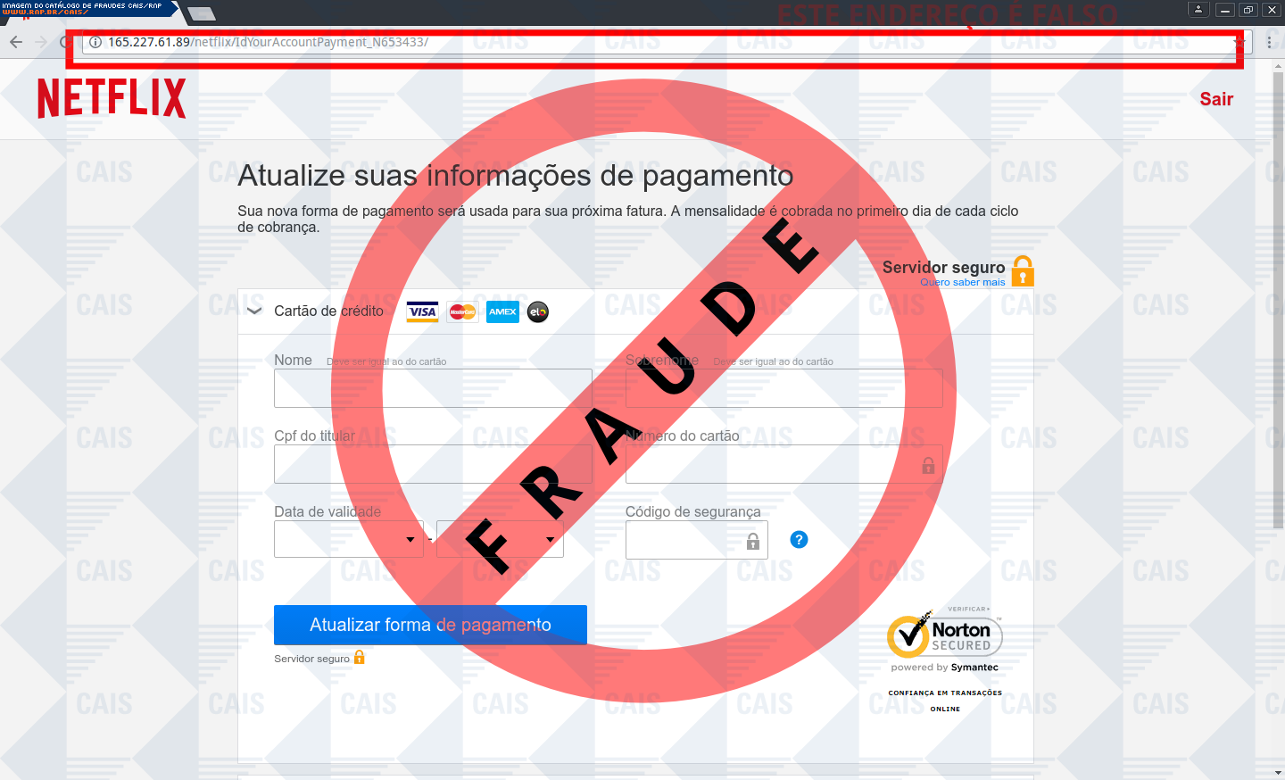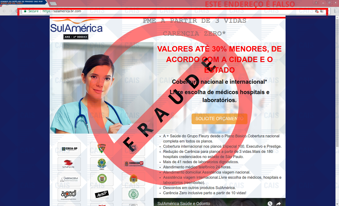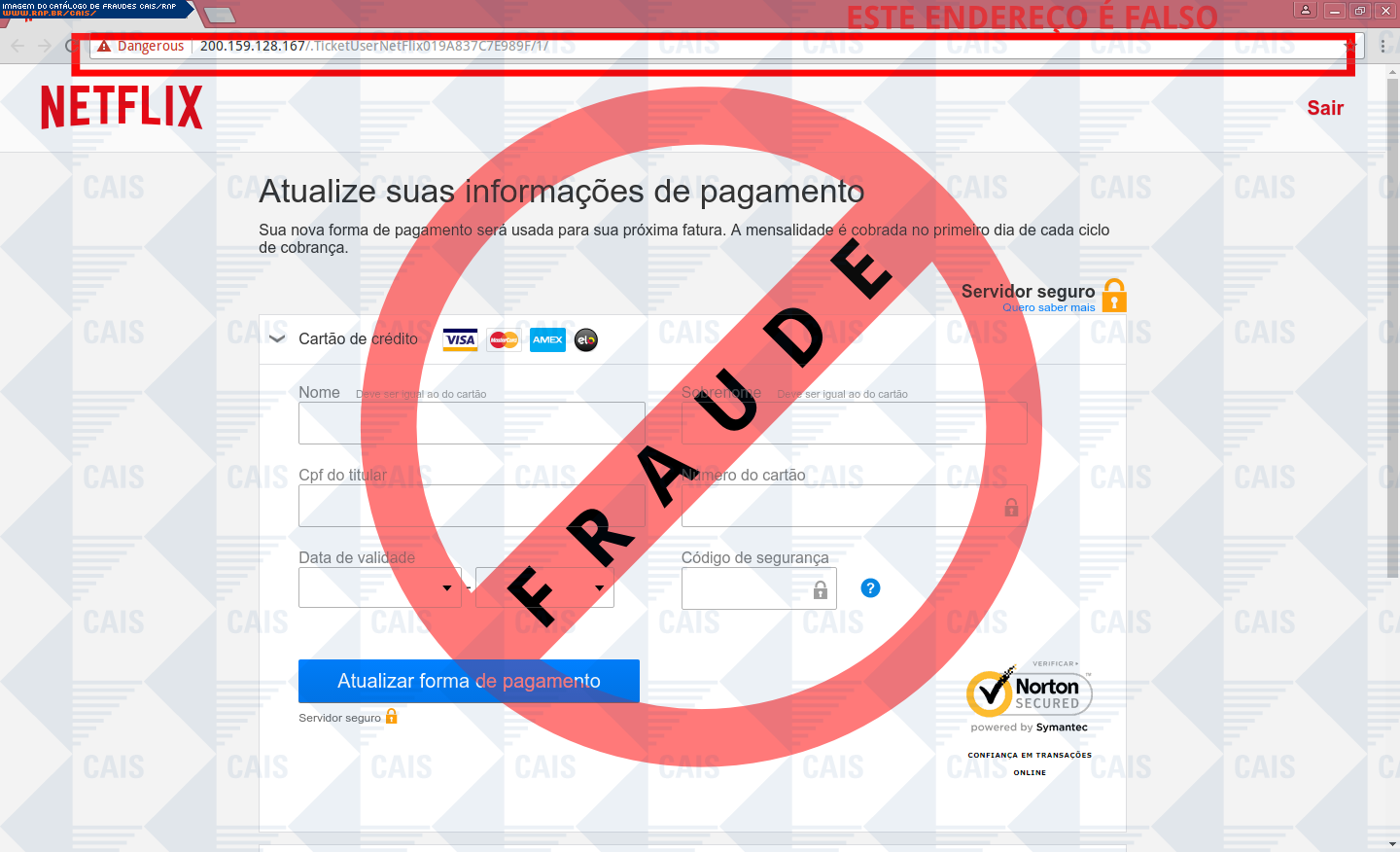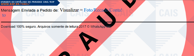 Esta página tem função informativa e educativa. Exibe uma coleção de imagens de phishing scam (fraudes eletrônicas) ou malware (código malicioso) veiculados por meio de spam (e-mail não-solicitado). Trata-se de conteúdo exemplificativo, não exaustivo, uma vez que não é possível contemplar todos os casos de fraudes existentes. Assim, caso você tenha conhecimento de um exemplar que não esteja aqui presente, isto não significa que não seja válido ou real. Inclusive incentivamos que você o envie para análise do CAIS para que, se for o caso, passe a integrar o nosso acervo.