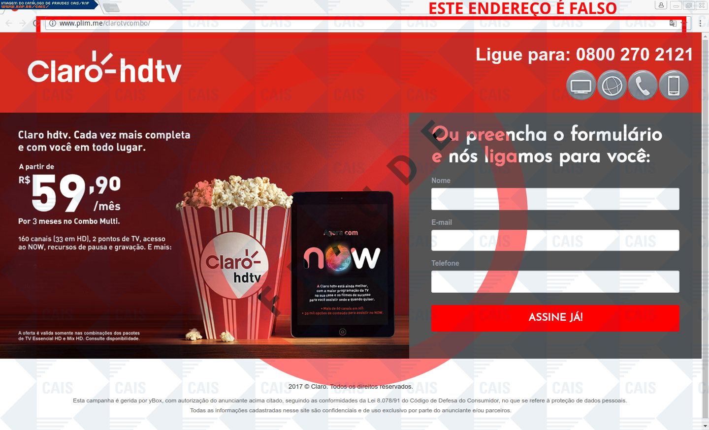 Com a disponibilização pública deste serviço, não é intenção do Centro de Atendimento a Incidentes de Segurança (CAIS) da Rede Nacional de Ensino e Pesquisa (RNP) violar direitos autorais sobre marcas registradas ou logotipos de empresas que porventura constem das amostras. O objetivo é tão somente alertar os usuários sobre as espécies de golpes que se utilizam de tais propriedades intelectuais ou industriais de forma criminosa.
