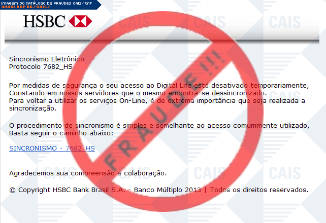 | comentário | O usuário recebe um e-mail solicitando que realize uma sincronização do seu "Digital Life" para continuar acessando os serviços do banco, mas ao acessar o link disponibilizado é levado a um site falso, apesar de muito semelhante ao site do banco. | |