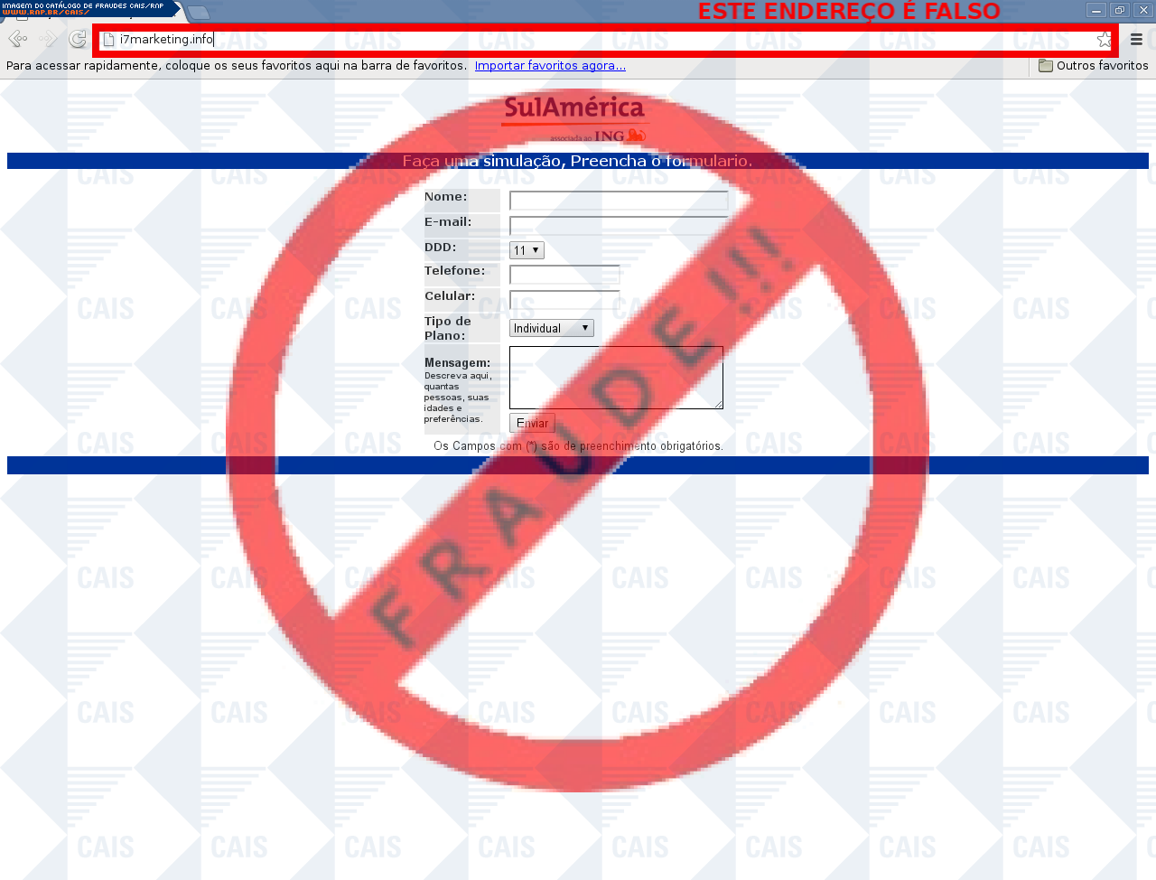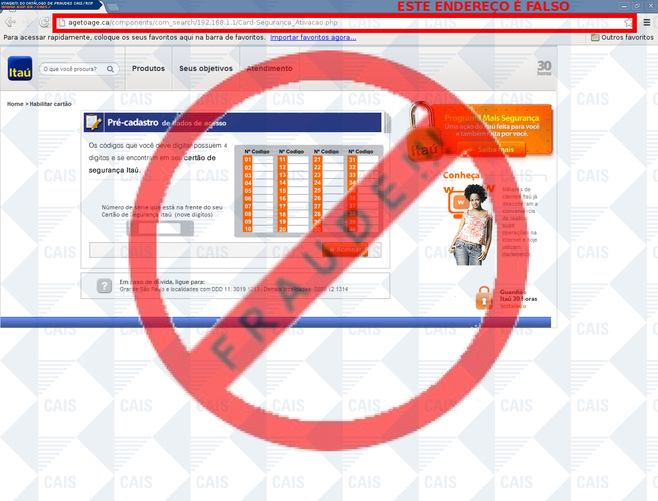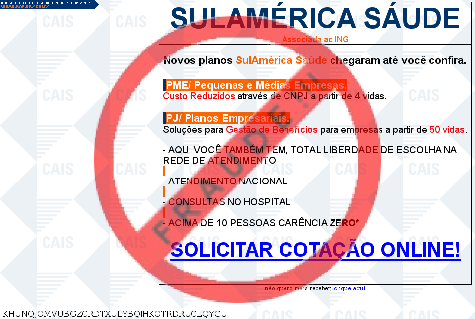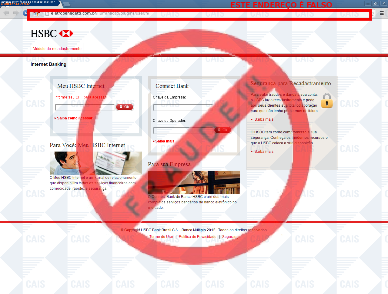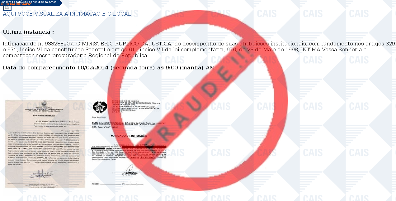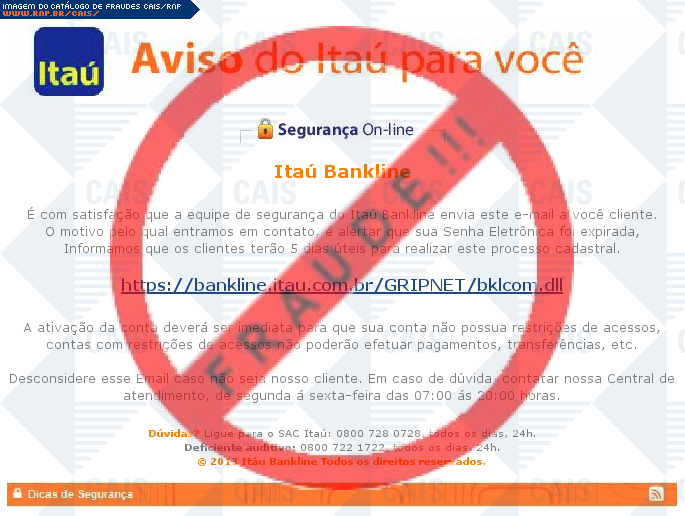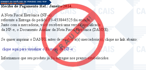 Esta página tem função informativa e educativa. Exibe uma coleção de imagens de phishing scam (fraudes eletrônicas) ou malware (código malicioso) veiculados por meio de spam (e-mail não-solicitado). Trata-se de conteúdo exemplificativo, não exaustivo, uma vez que não é possível contemplar todos os casos de fraudes existentes. Assim, caso você tenha conhecimento de um exemplar que não esteja aqui presente, isto não significa que não seja válido ou real. Inclusive incentivamos que você o envie para análise do CAIS para que, se for o caso, passe a integrar o nosso acervo.