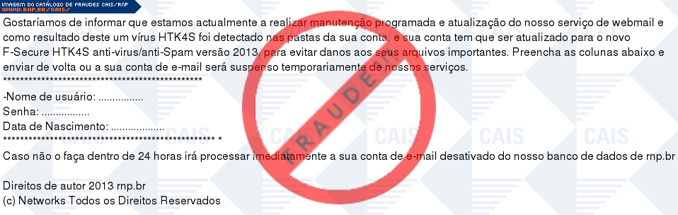 | comentário | A vítima recebe uma mensagem, informando que um vírus foi detectado nas pastas da sua conta, e sua conta tem que ser atualizada. Pede para preencher com seus dados e enviar de volta. | |