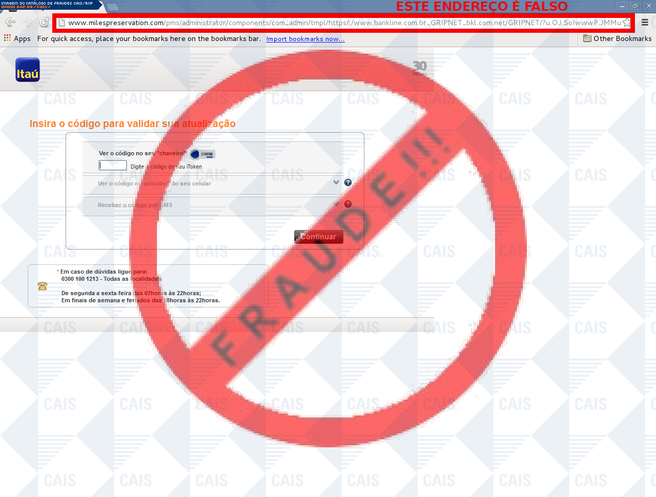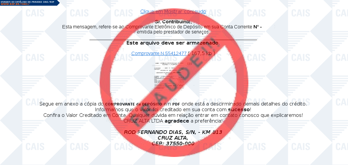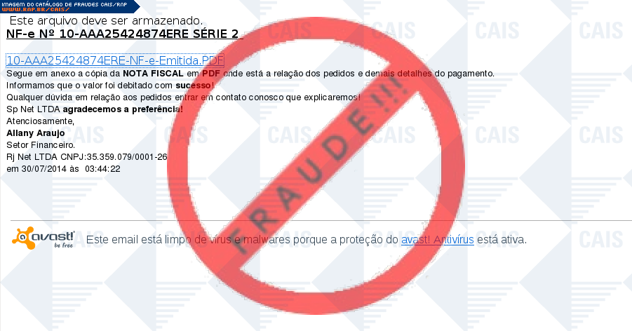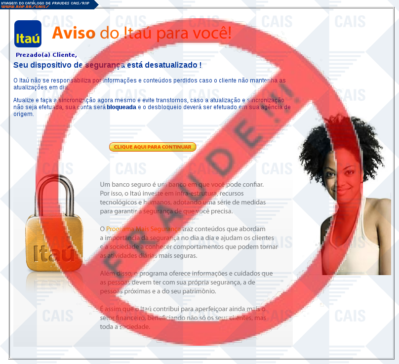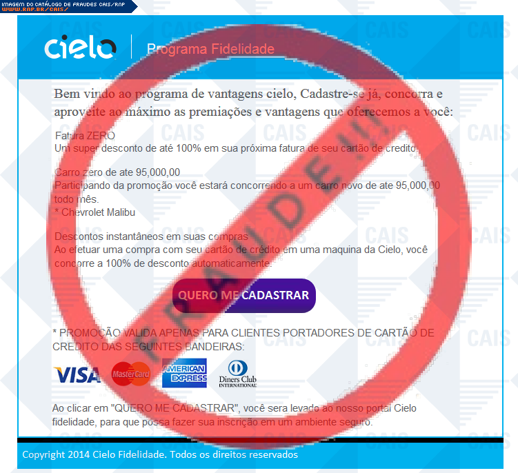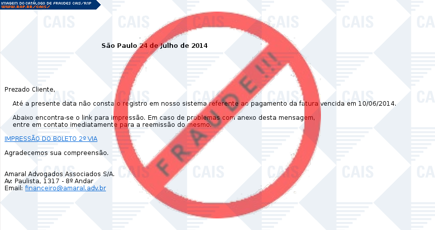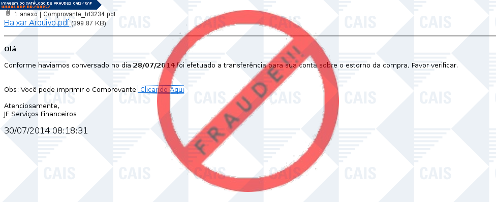 Esta página tem função informativa e educativa. Exibe uma coleção de imagens de phishing scam (fraudes eletrônicas) ou malware (código malicioso) veiculados por meio de spam (e-mail não-solicitado). Trata-se de conteúdo exemplificativo, não exaustivo, uma vez que não é possível contemplar todos os casos de fraudes existentes. Assim, caso você tenha conhecimento de um exemplar que não esteja aqui presente, isto não significa que não seja válido ou real. Inclusive incentivamos que você o envie para análise do CAIS para que, se for o caso, passe a integrar o nosso acervo.