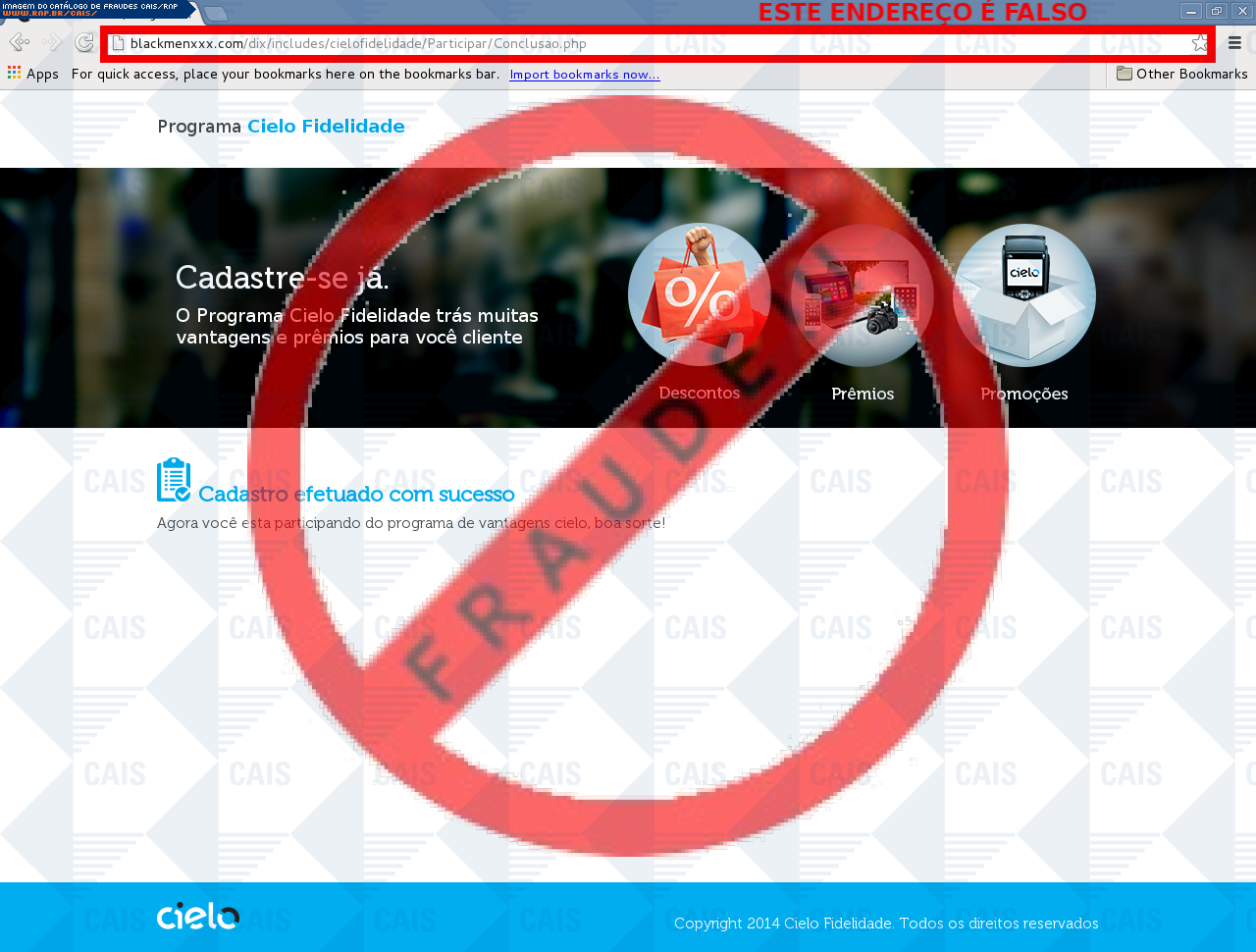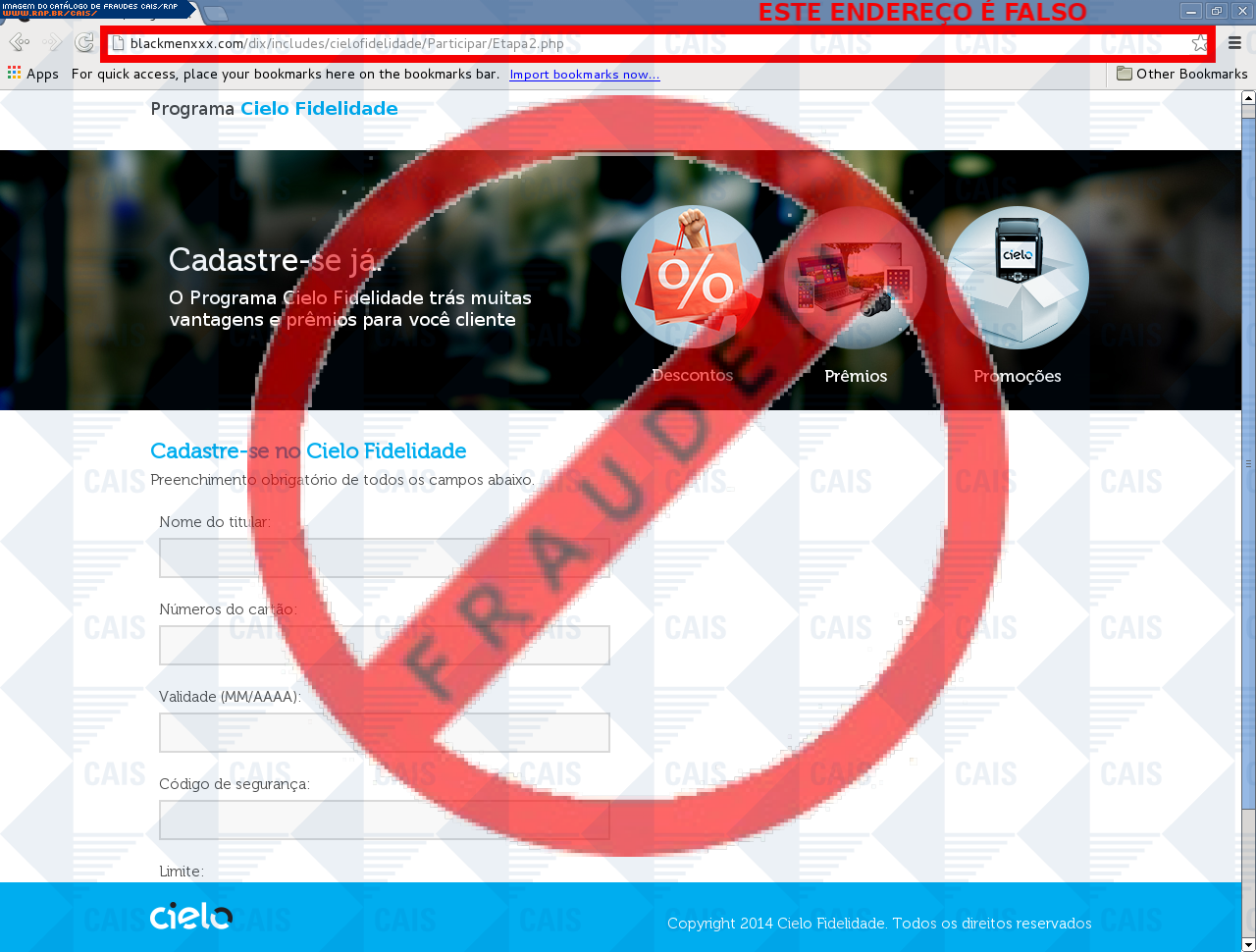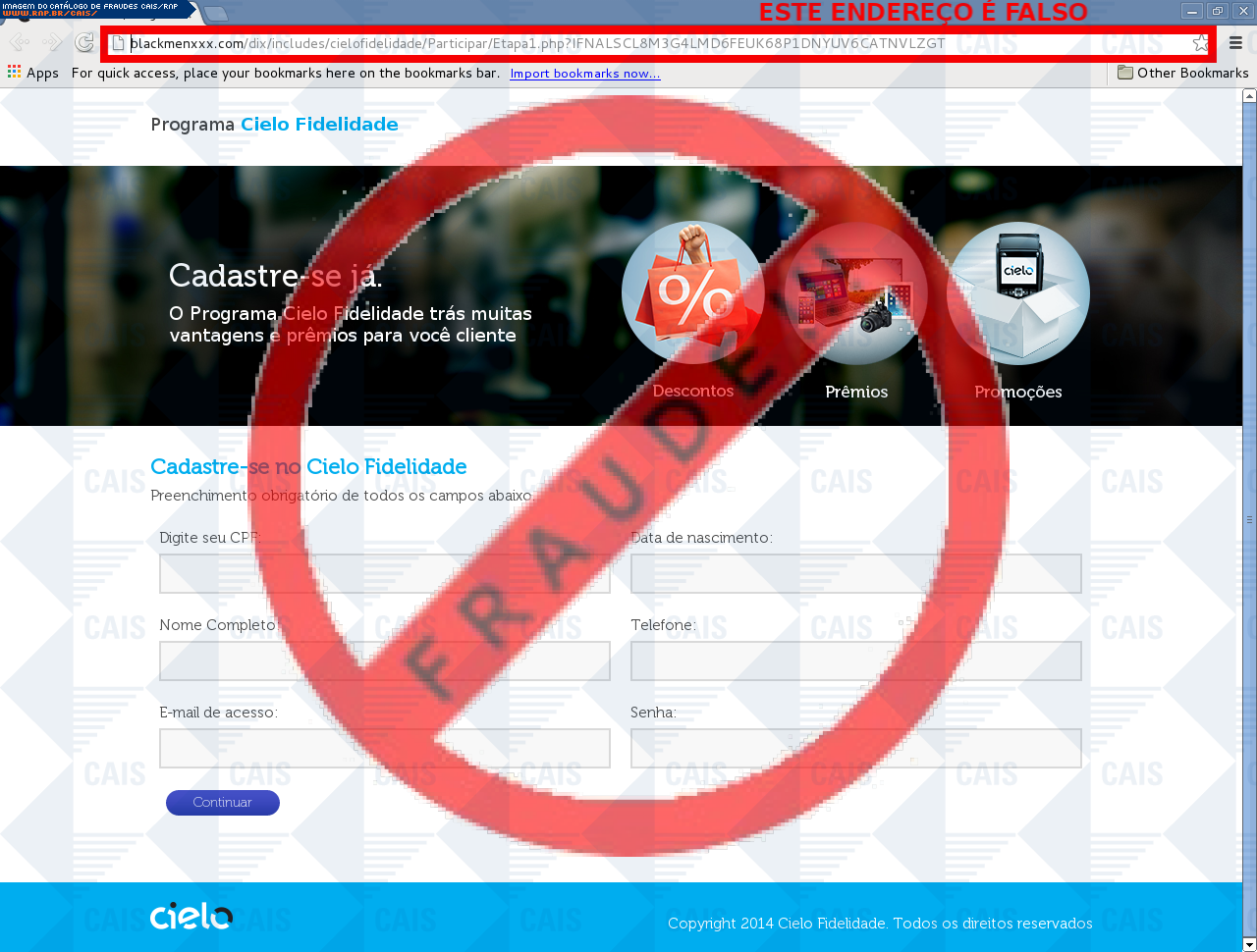 | comentário | A vítima recebe uma mensagem disponibilizando cadastro no programa de fidelidade, no entanto a página é falsa destinada a roubar informações do usuário. | |