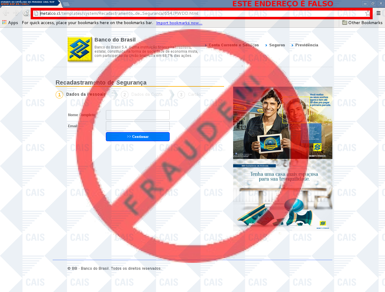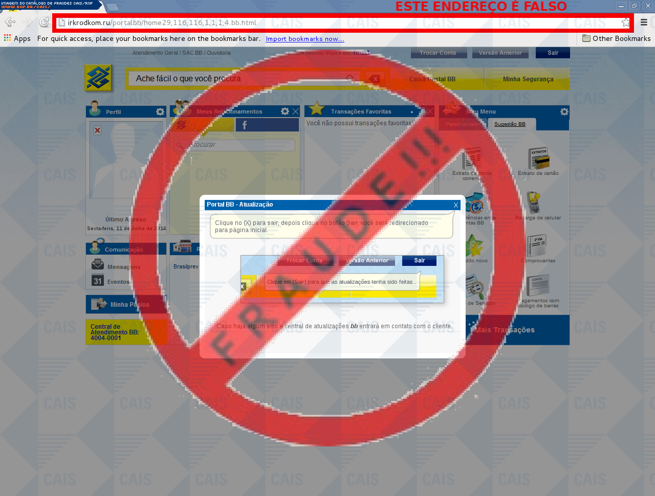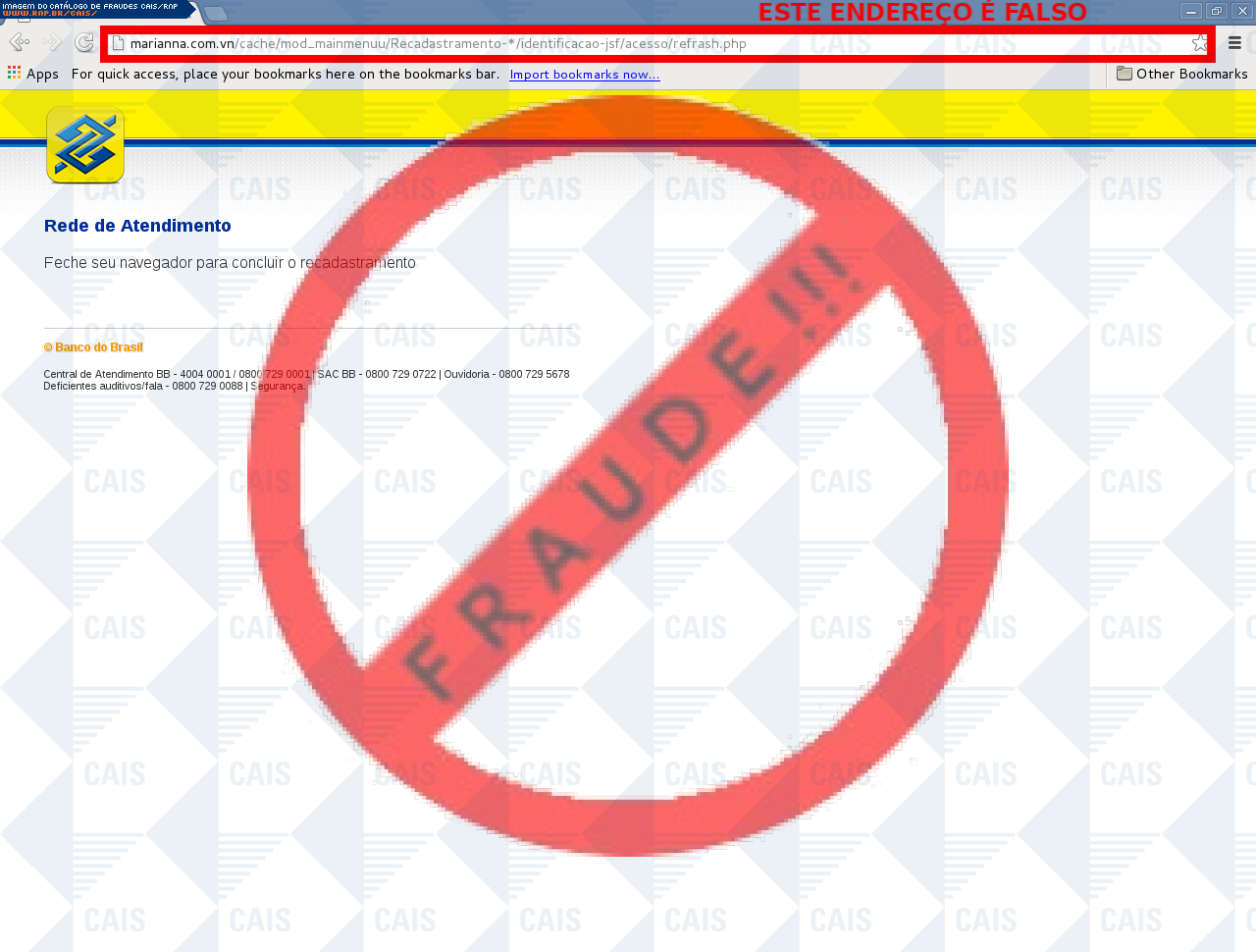 | comentário | O usuário recebe uma mensagem informando que o sistema do Banco do Brasil atualizou sendo necessário realizar uma atualização também na sua conta, no entanto a página é falsa destinada a roubar as informações bancárias do usuário. | |