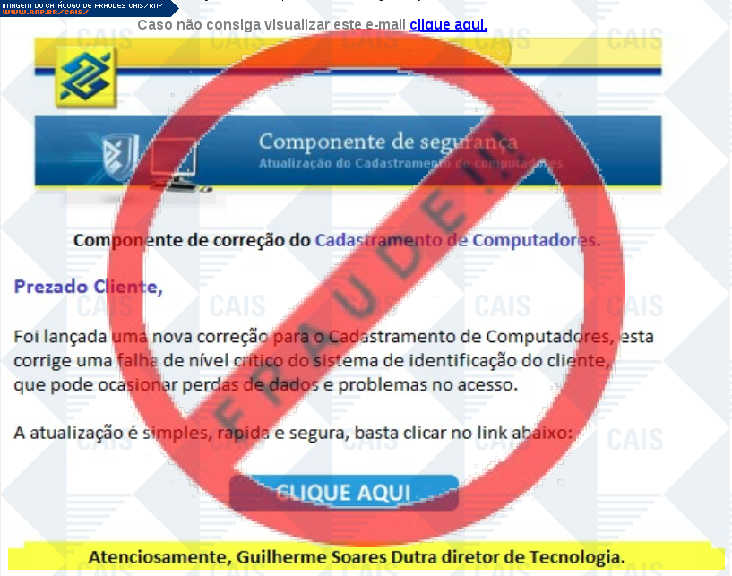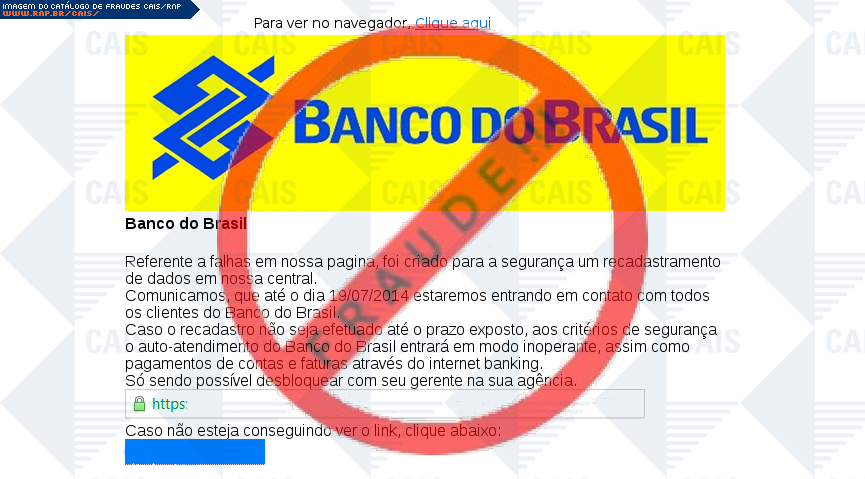Esta página tem função informativa e educativa. Exibe uma coleção de imagens de phishing scam (fraudes eletrônicas) ou malware (código malicioso) veiculados por meio de spam (e-mail não-solicitado). Trata-se de conteúdo exemplificativo, não exaustivo, uma vez que não é possível contemplar todos os casos de fraudes existentes. Assim, caso você tenha conhecimento de um exemplar que não esteja aqui presente, isto não significa que não seja válido ou real. Inclusive incentivamos que você o envie para análise do CAIS para que, se for o caso, passe a integrar o nosso acervo.