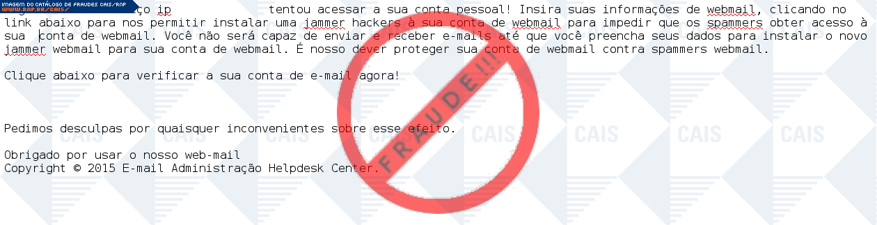 | comentário | A vítima recebe uma mensagem dizendo que um IP tentou acessar sua conta pessoal e que ela precisa fazer um recadastramento ou não conseguirá mais enviar emails. Porém, o email é falso e tenta roubar as informações de email da vítima. | |