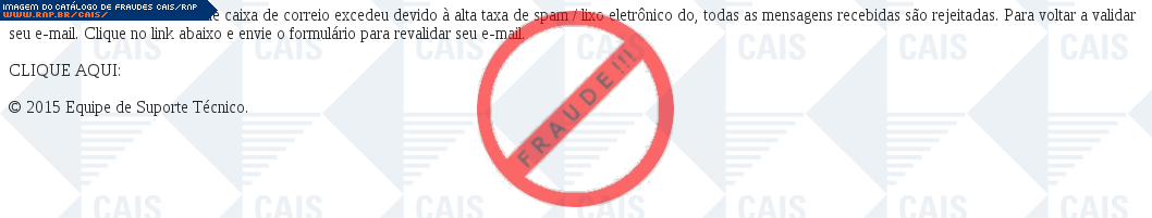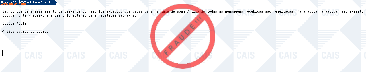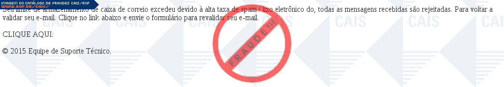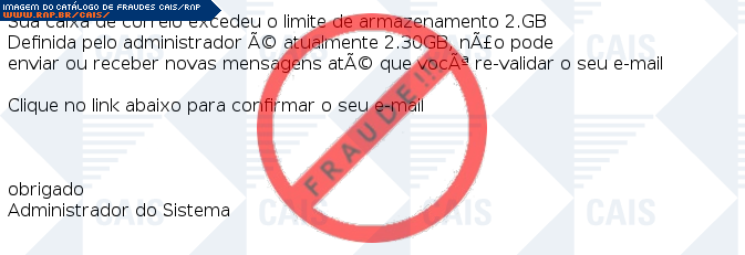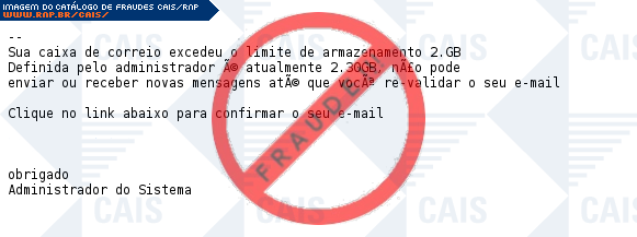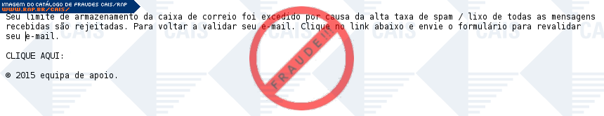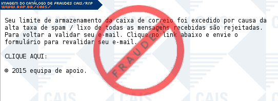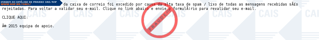 | comentário | A vítima recebe uma mensagem dizendo que sua caixa de correio excedeu devido à alta taxa de spam / lixo eletrônico e que ela deve revalidar seu email através de um link na mensagem. Entretanto, o referido link leva a uma página falsa que tenta roubar informações... (leia mais) | |