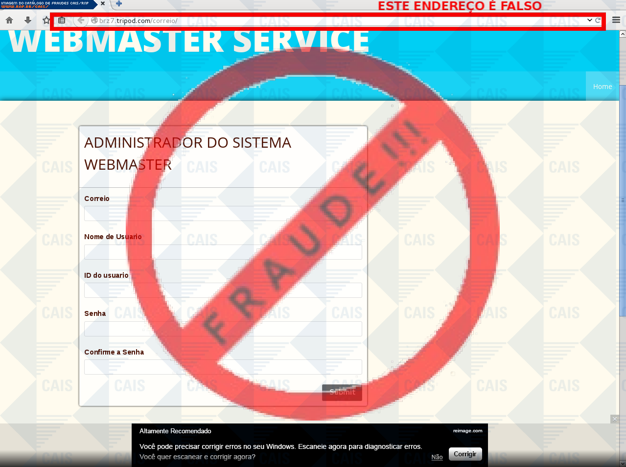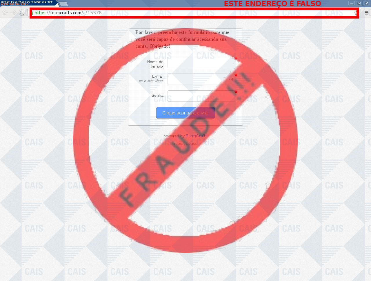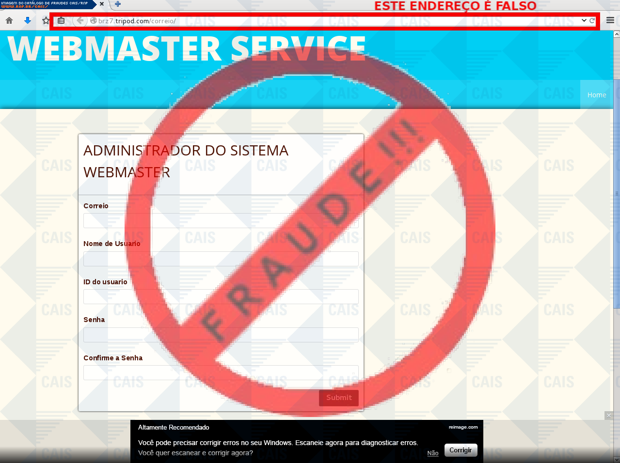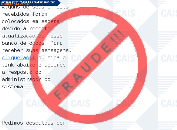 Esta página tem função informativa e educativa. Exibe uma coleção de imagens de phishing scam (fraudes eletrônicas) ou malware (código malicioso) veiculados por meio de spam (e-mail não-solicitado). Trata-se de conteúdo exemplificativo, não exaustivo, uma vez que não é possível contemplar todos os casos de fraudes existentes. Assim, caso você tenha conhecimento de um exemplar que não esteja aqui presente, isto não significa que não seja válido ou real. Inclusive incentivamos que você o envie para análise do CAIS para que, se for o caso, passe a integrar o nosso acervo.