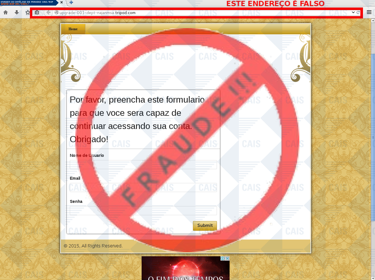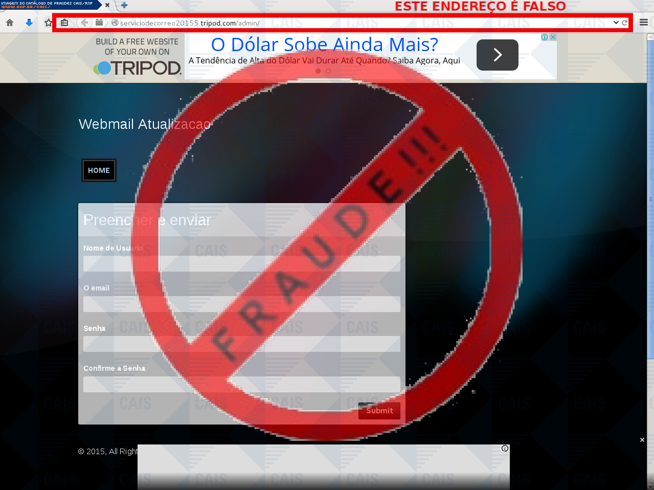 | comentário | O usuário recebe uma mensagem informando que sua conta de webmail deve proteger-se de ameaças sendo necessário realizar uma atualização, no entanto a página é falsa criada para roubar os dados de login da vítima. | |
