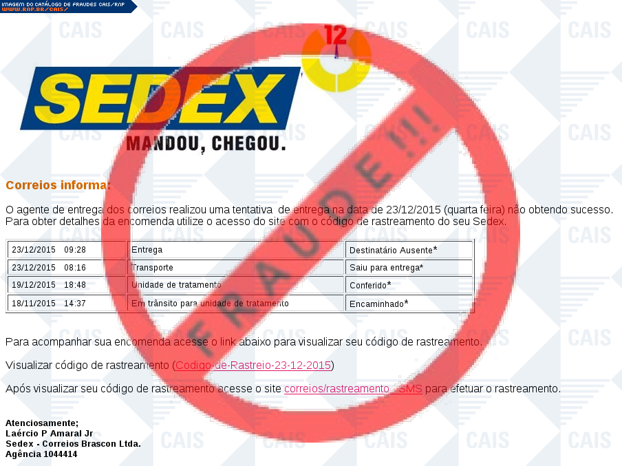 Esta página tem função informativa e educativa. Exibe uma coleção de imagens de phishing scam (fraudes eletrônicas) ou malware (código malicioso) veiculados por meio de spam (e-mail não-solicitado). Trata-se de conteúdo exemplificativo, não exaustivo, uma vez que não é possível contemplar todos os casos de fraudes existentes. Assim, caso você tenha conhecimento de um exemplar que não esteja aqui presente, isto não significa que não seja válido ou real. Inclusive incentivamos que você o envie para análise do CAIS para que, se for o caso, passe a integrar o nosso acervo.