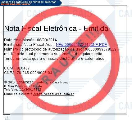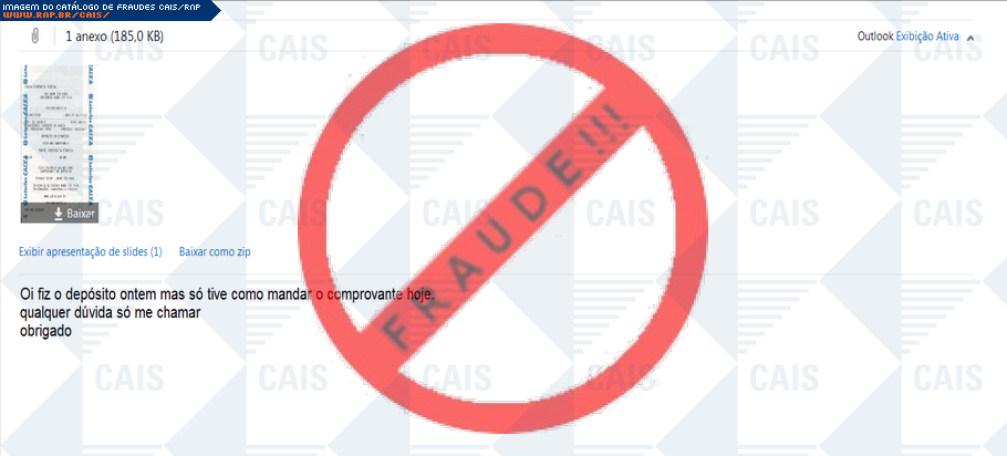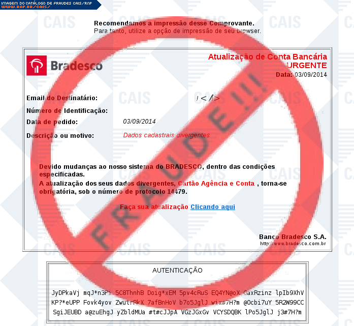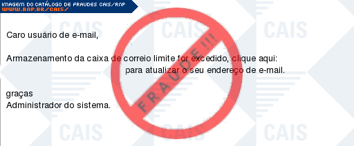 Esta página tem função informativa e educativa. Exibe uma coleção de imagens de phishing scam (fraudes eletrônicas) ou malware (código malicioso) veiculados por meio de spam (e-mail não-solicitado). Trata-se de conteúdo exemplificativo, não exaustivo, uma vez que não é possível contemplar todos os casos de fraudes existentes. Assim, caso você tenha conhecimento de um exemplar que não esteja aqui presente, isto não significa que não seja válido ou real. Inclusive incentivamos que você o envie para análise do CAIS para que, se for o caso, passe a integrar o nosso acervo.