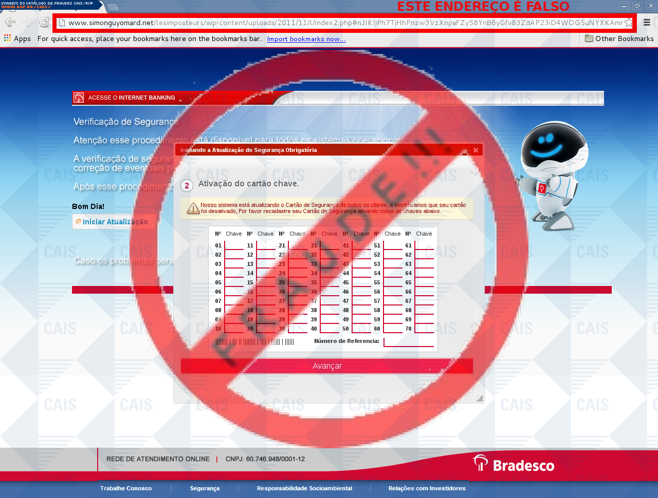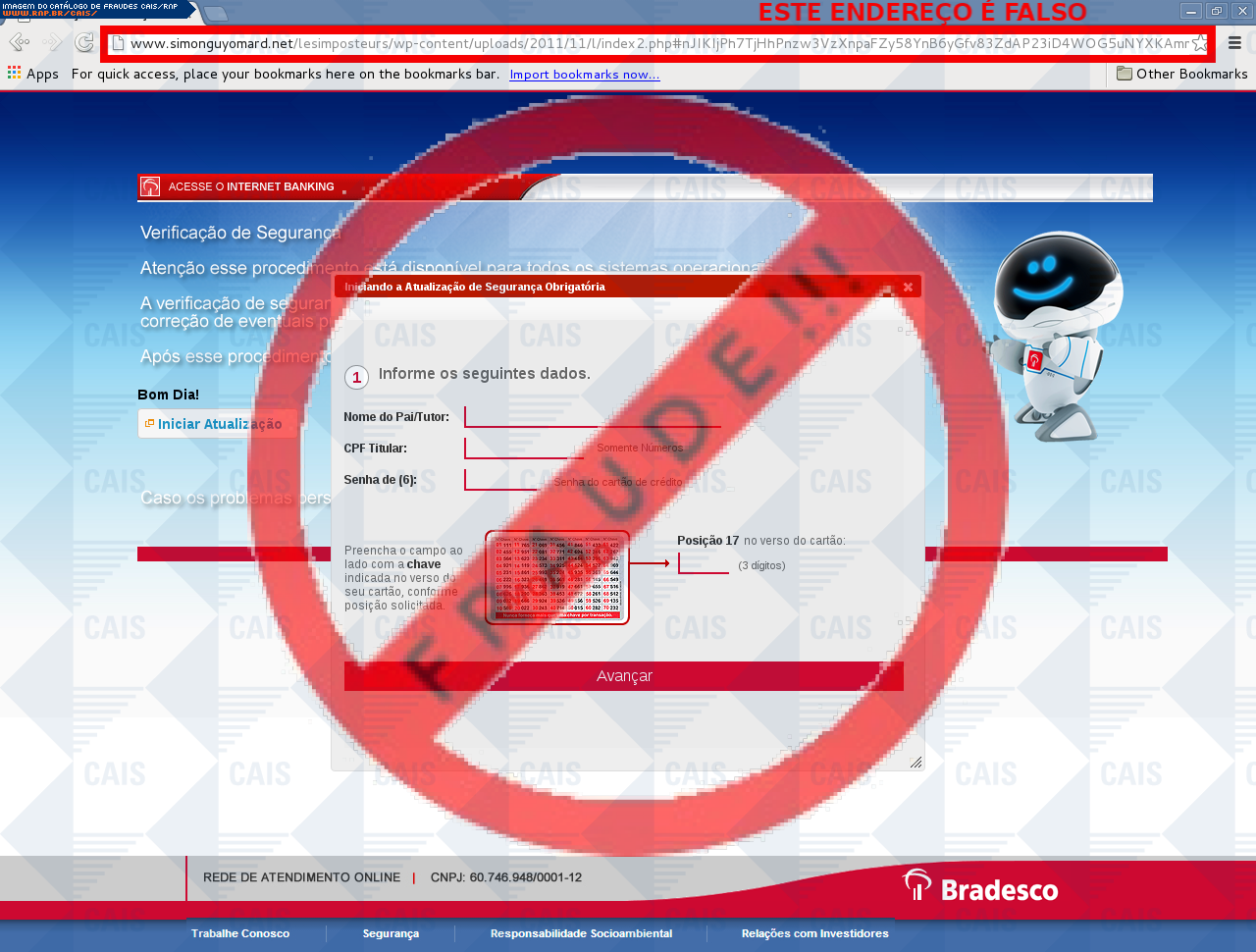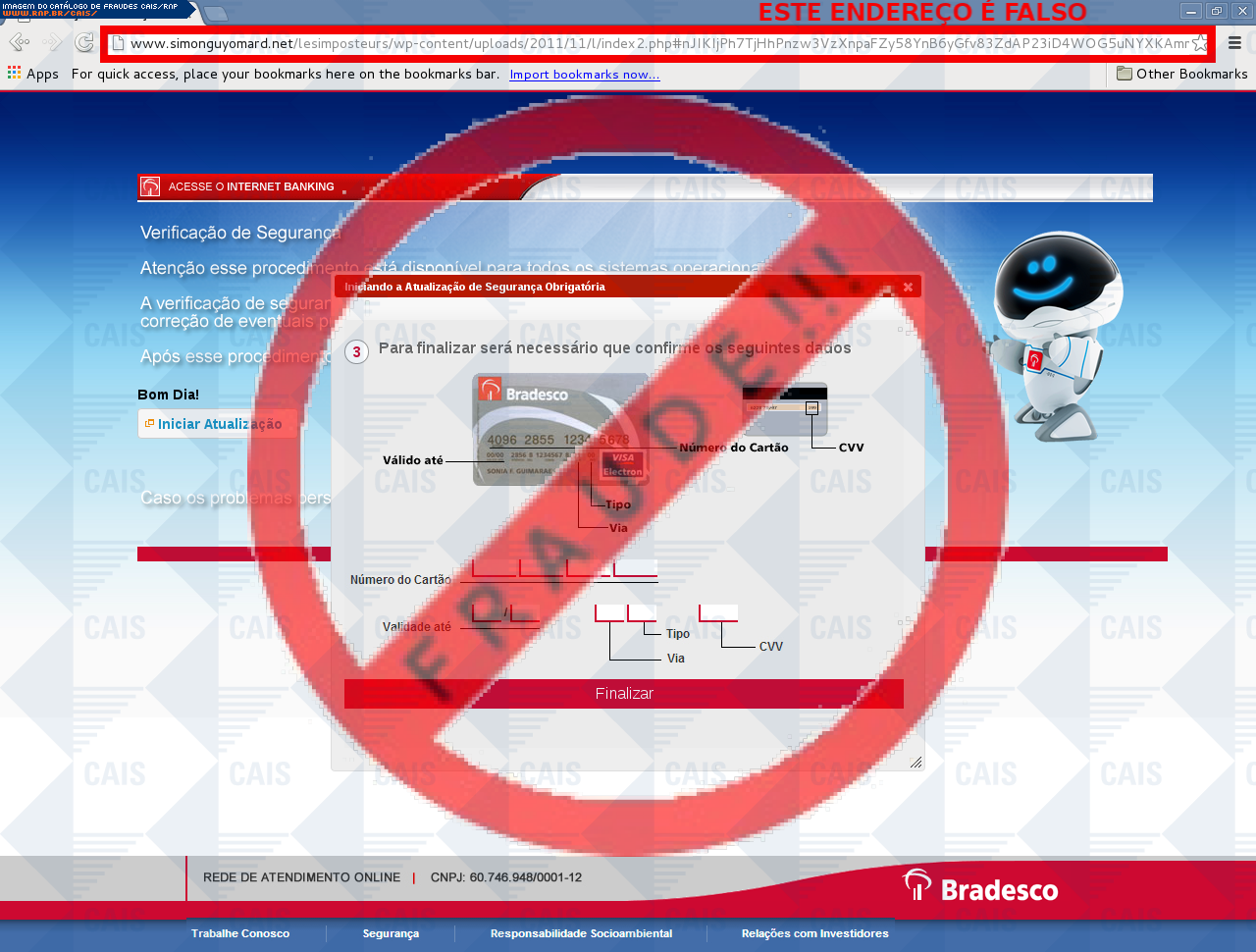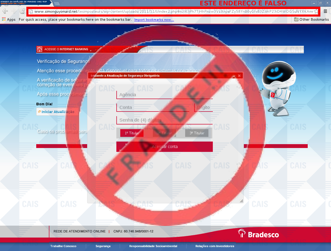 | comentário | A vítima recebe uma mensagem informando que devido a algumas mudanças sua conta no banco do Bradesco esta com o cadastro desatualizado sendo necessário realiza-lo no link disponibilizado, no entanto a página é falsa destinada a roubar as informações bancárias... (leia mais) | |