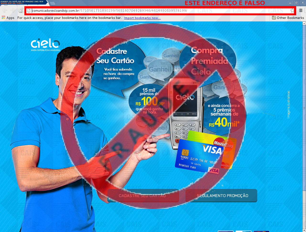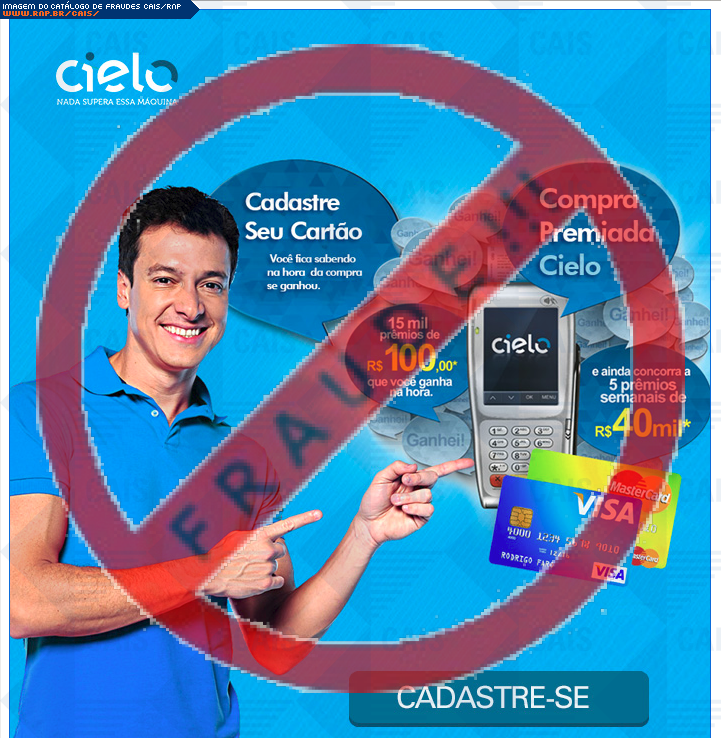 | comentário | A vítima recebe um e-mail informando sobre promoções relacionados a seu cartão Cielo sendo necessário realizar um cadastro, no entanto a página é falsa destinada a roubar os dados do cartão de crédito do usuário. | |