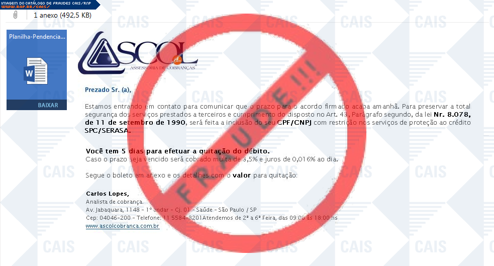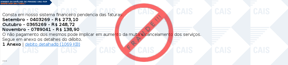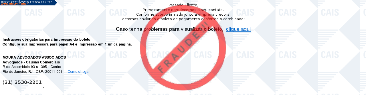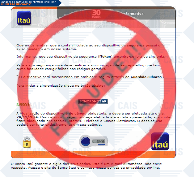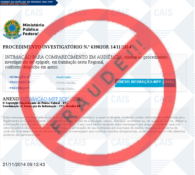 Esta página tem função informativa e educativa. Exibe uma coleção de imagens de phishing scam (fraudes eletrônicas) ou malware (código malicioso) veiculados por meio de spam (e-mail não-solicitado). Trata-se de conteúdo exemplificativo, não exaustivo, uma vez que não é possível contemplar todos os casos de fraudes existentes. Assim, caso você tenha conhecimento de um exemplar que não esteja aqui presente, isto não significa que não seja válido ou real. Inclusive incentivamos que você o envie para análise do CAIS para que, se for o caso, passe a integrar o nosso acervo.