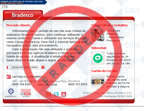 | comentário | O usuário recebe um e-mail informando que sua chave de segurança da conta do banco Bradesco expirou sendo necessário realizar uma atualização no link disponibilizado, entretanto a página fornecida é falsa criada para roubar os dados bancários da vítima. | |