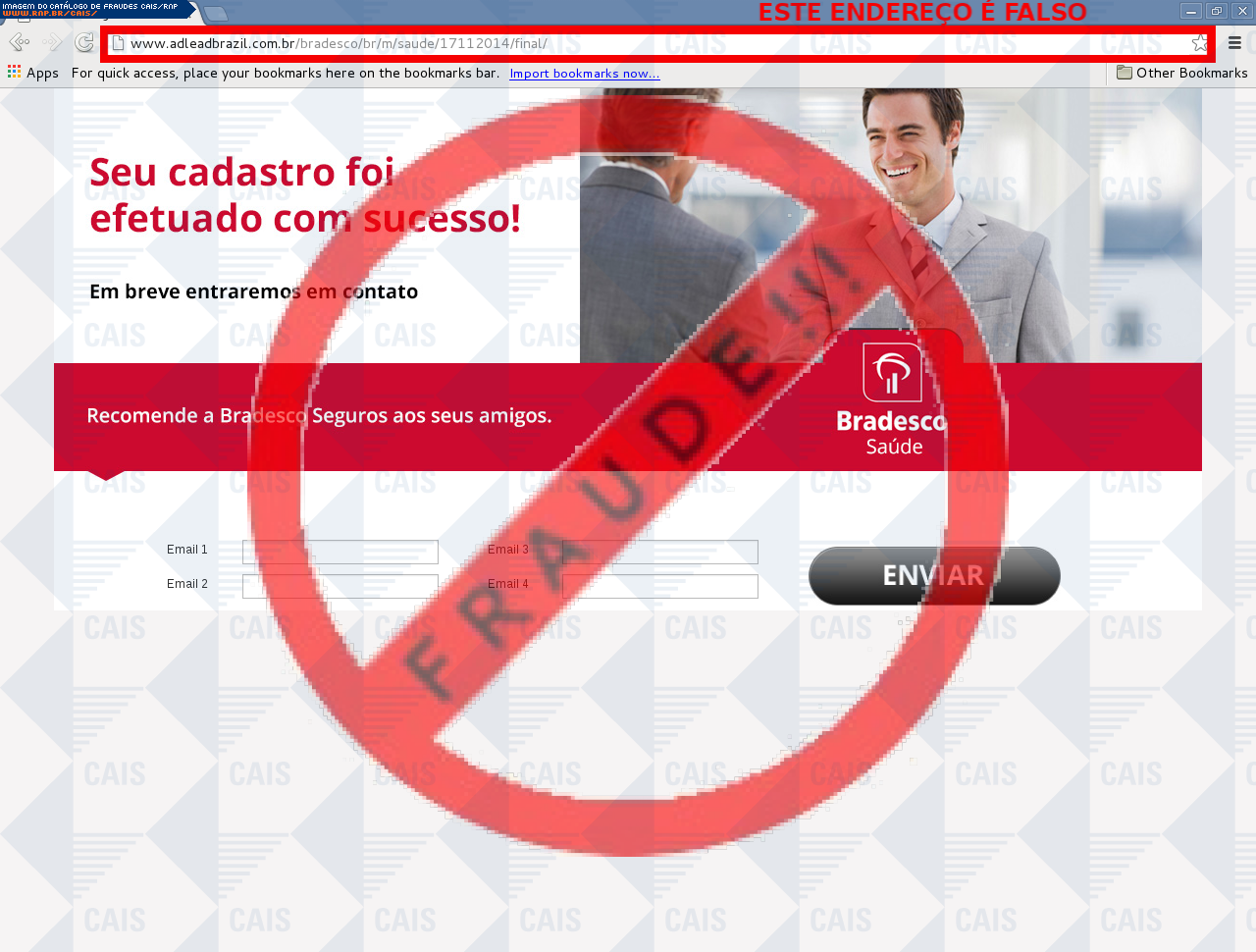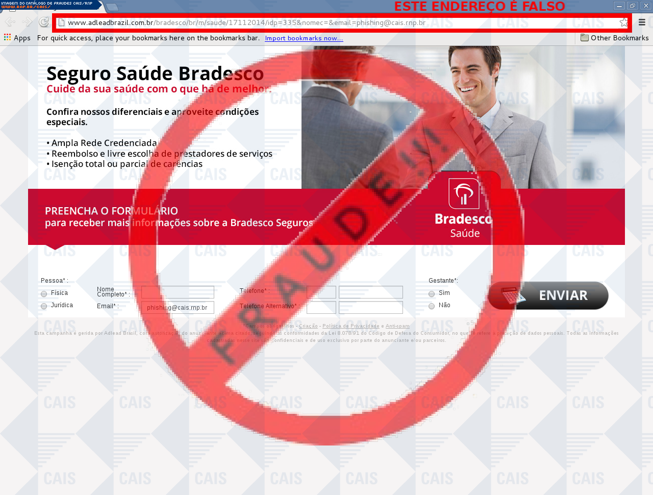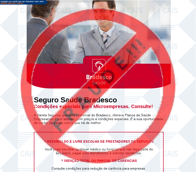 | comentário | A vítima recbe um e-mail informando sobre o plano de seguro de saúde Bradesco estando o link para cadastro disponível, entretanto a página é falsa criada para roubar dados do usuário. | |