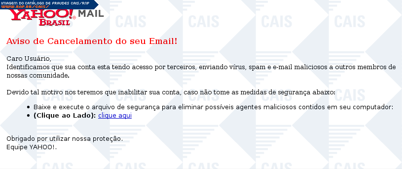 | comentário | Mensagem que tenta se passar por um comunicado do Yahoo! Mail Brasil. A mensagem informa que a conta do usuário tem sido origem de atividade maliciosa e que é necessária a execução de um programa ("arquivo de segurança") para eliminar "possíveis agentes maliciosos".... (leia mais) | |
