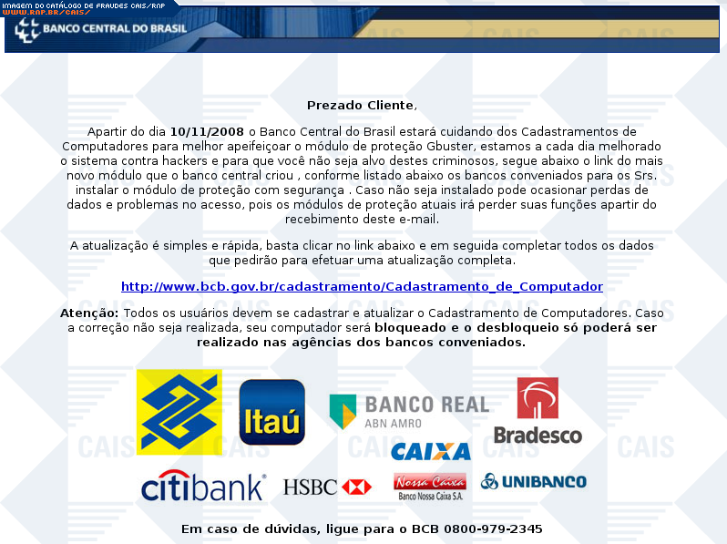 | comentário | Mensagem que traz um suposto informativo do Banco Central do Brasil (BCB) a respeito de uma atualização necessária. Os logotipos de vários bancos estão presentes na mensagem: Banco do Brasil, Itaú, Banco Real ABN Amro, Bradesco, Citibank, HSBC, Nossa Caixa... (leia mais) | |