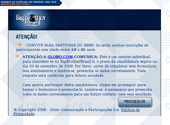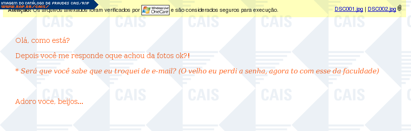 Esta página tem função informativa e educativa. Exibe uma coleção de imagens de phishing scam (fraudes eletrônicas) ou malware (código malicioso) veiculados por meio de spam (e-mail não-solicitado). Trata-se de conteúdo exemplificativo, não exaustivo, uma vez que não é possível contemplar todos os casos de fraudes existentes. Assim, caso você tenha conhecimento de um exemplar que não esteja aqui presente, isto não significa que não seja válido ou real. Inclusive incentivamos que você o envie para análise do CAIS para que, se for o caso, passe a integrar o nosso acervo.