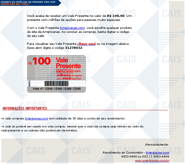 | comentário | Mensagem que se passa por um comunicado do site Americanas.com, informando sobre um suposto vale presente no valor de R$100,00. O software malicioso é Mal_Banker (TrendMicro). | |