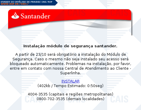 | comentário | Mensagem que tenta se passar por um comunicado do banco Santander que informa sobre a necessidade de instalação de um suposto "módulo de segurança". OBS. (1) o software malicioso da amostra não estava mais disponível no momento da análise. | |