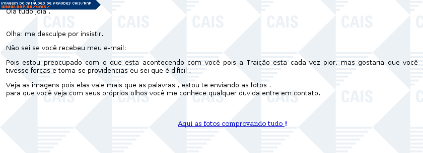 | comentário | Mais uma mensagem com o típico tema traição. Uma pessoa que não se identifica envia fotos que provam uma suposta traição por parte da parceira / parceiro do usuário. O software malicioso é Suspicious:W32/Malware!Gemini (F-Secure). | |