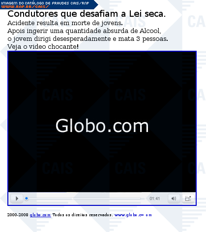 | comentário | Mensagem que explora um tema polêmico e que atrai a atenção das pessoas: flagrantes de direção perigosa. A mensagem traz um suposto "vídeo chocante" do site Globo.com que mostra cenas do atropelamento de 3 pessoas por um motorista jovem e embriagado. OBS.... (leia mais) | |