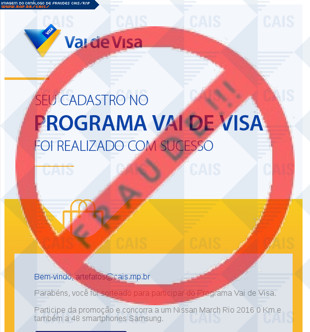 | comentário | A vítima recebe um e-mail informando sobre as vantagens da promoção programa vai de visa do cartão Visa sendo o cadastro através do link disponibilizado, no entanto a página é falsa criada para roubar informações do usuário. | |