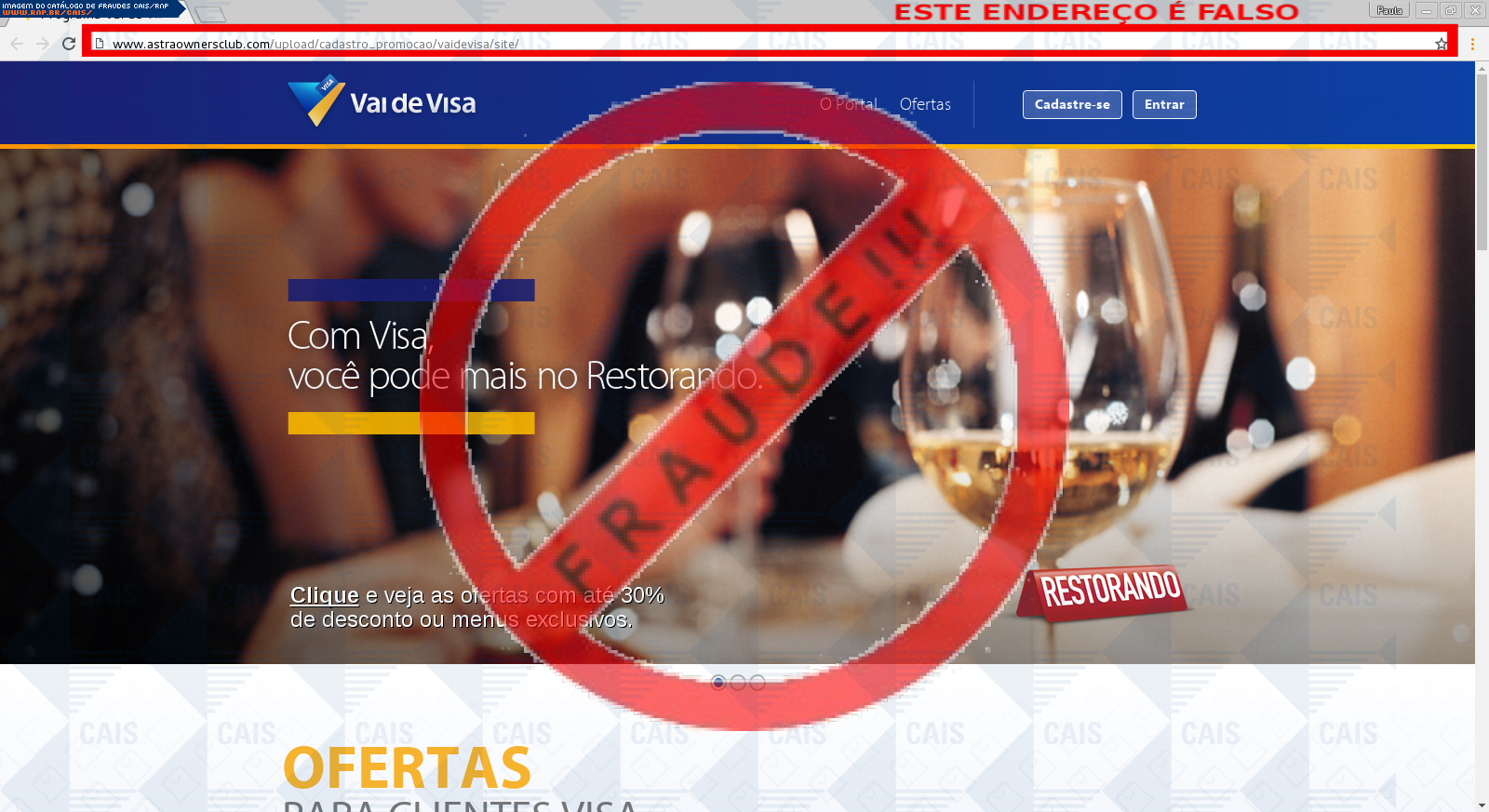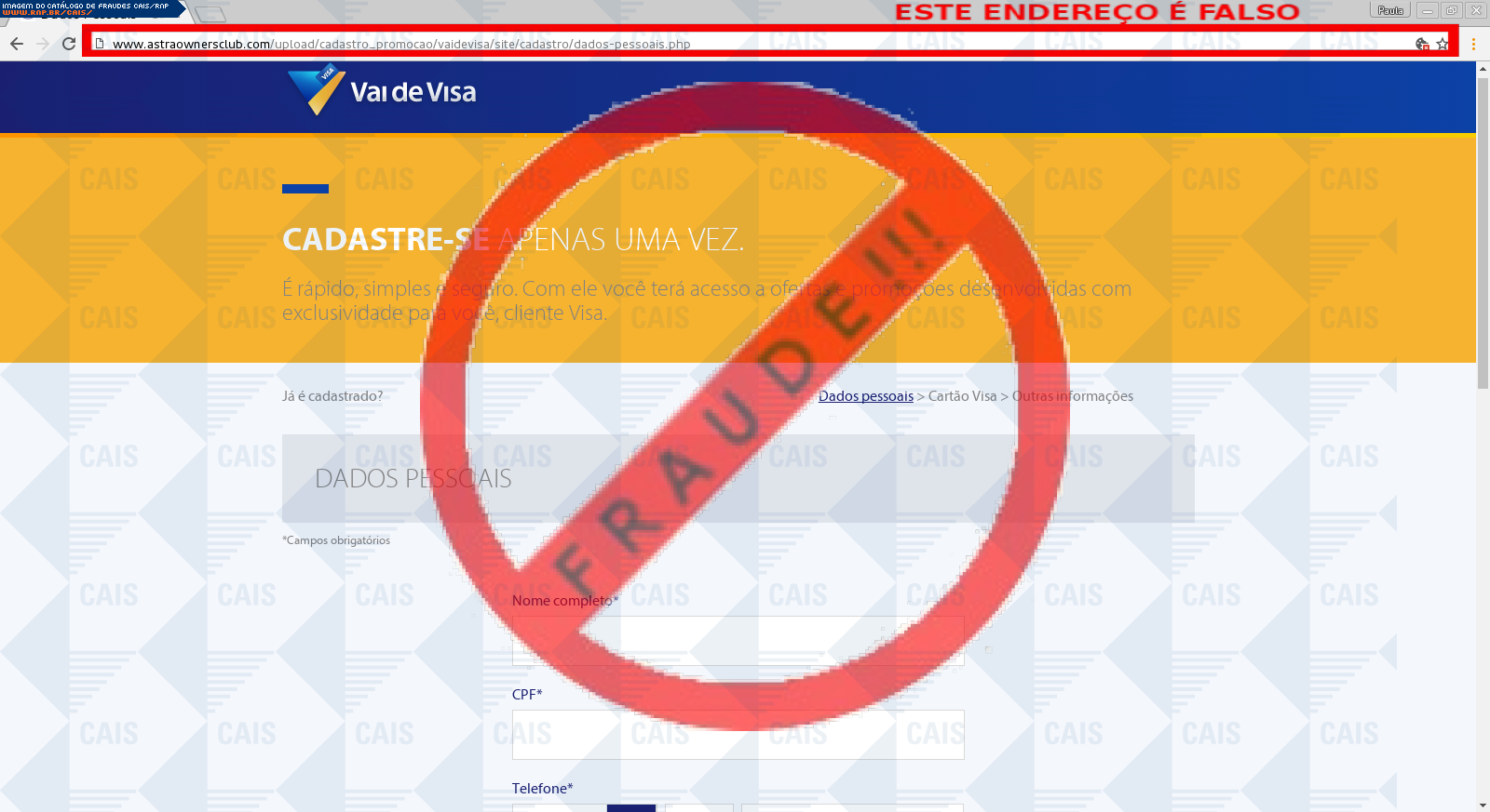 | comentário | A vítima recebe um e-mail informando sobre as vantagens da promoção Vai de Visa do cartão Visa sendo o cadastro através do link disponibilizado, no entanto a página é falsa criada para roubar informações do usuário. | |