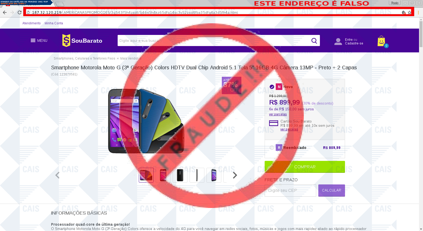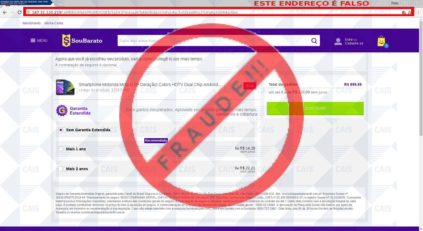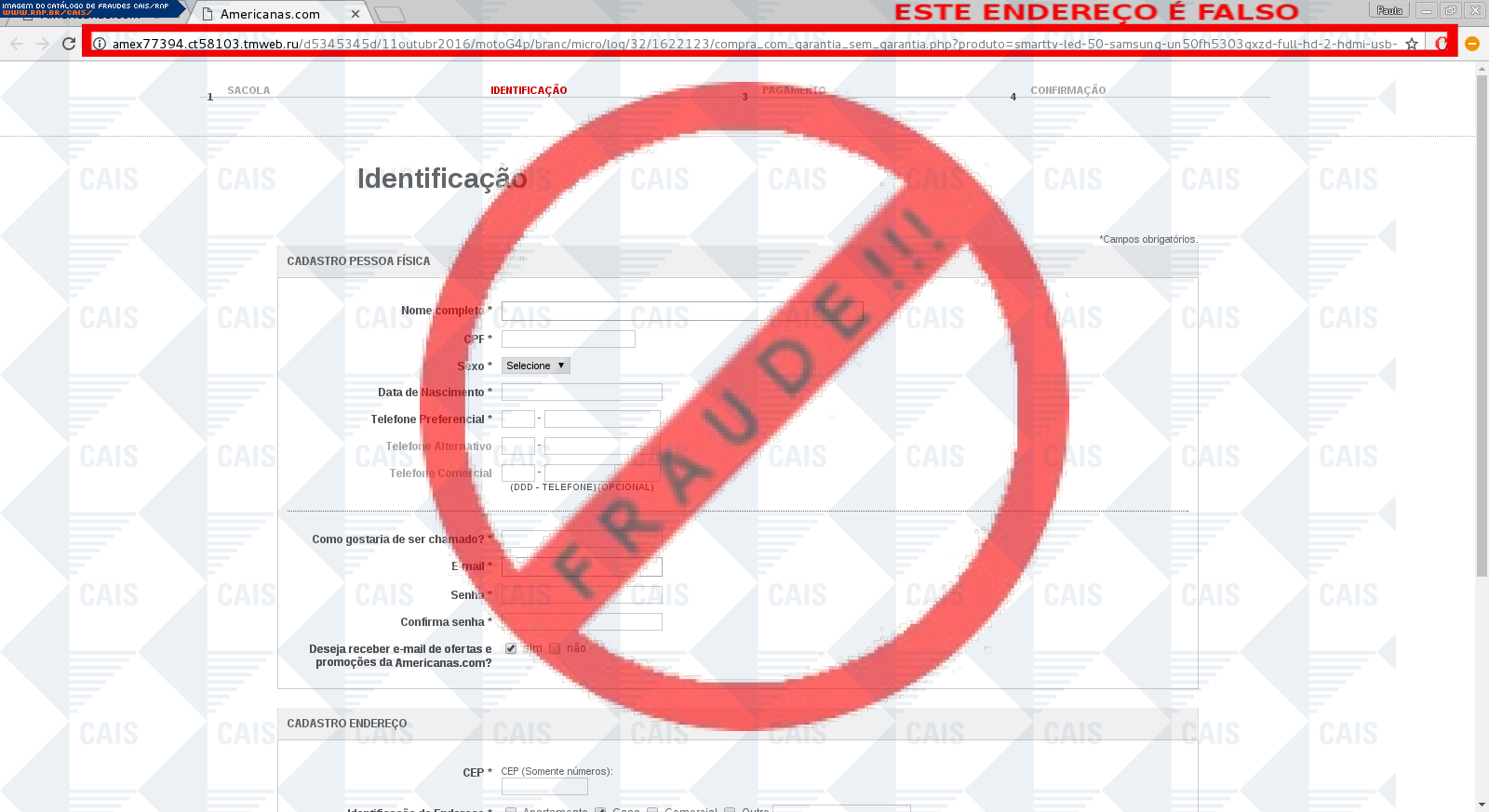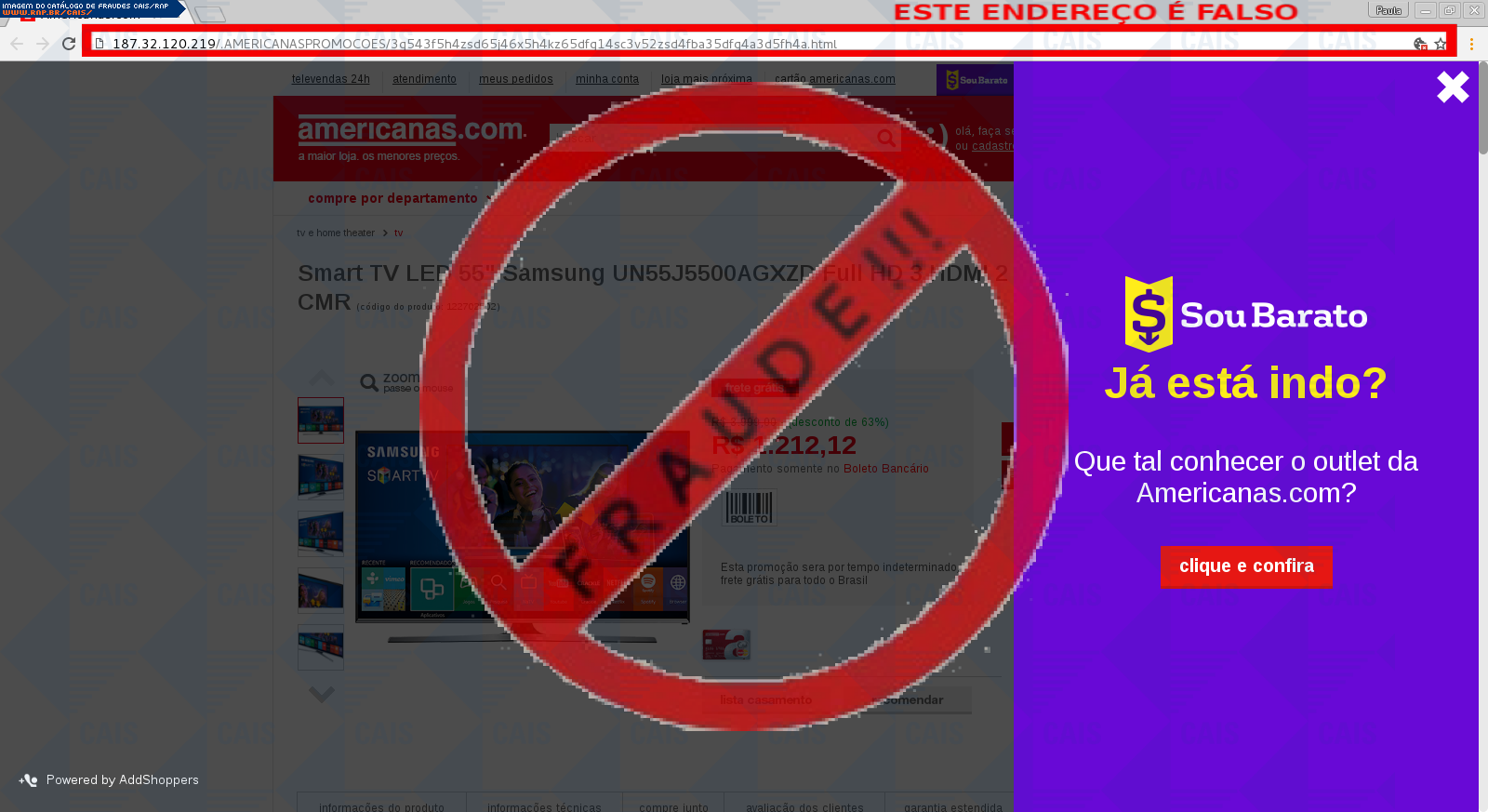 | comentário | A vítima recebe um e-mail informando sobre promoções no site de compra das lojas Americanas e do Sou Barato disponibilizando link de vários produtos em desconto, no entanto a página é falsa destinada a roubar as informações pessoais e do cartão de crédito/débito... (leia mais) | |