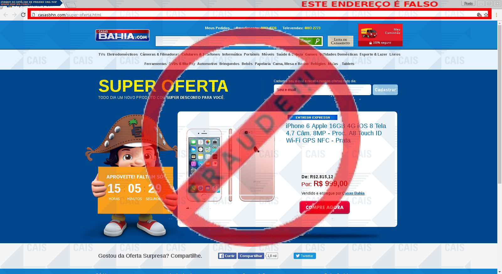 | comentário | A vítima recebe um e-mail informando sobre promoções no site de compra da Casas Bahia disponibilizando link de celular Iphone em desconto, no entanto a página é falsa destinada a roubar as informações pessoais e do cartão de crédito/débito do usuário. | |