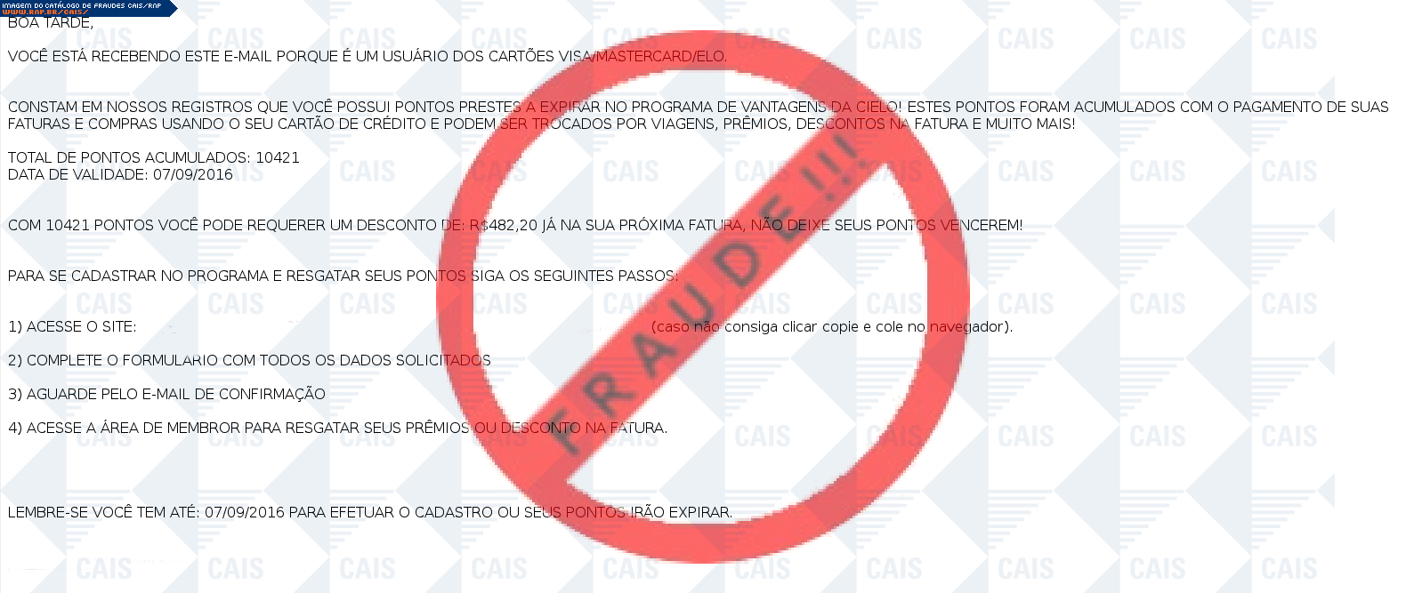 Esta página tem função informativa e educativa. Exibe uma coleção de imagens de phishing scam (fraudes eletrônicas) ou malware (código malicioso) veiculados por meio de spam (e-mail não-solicitado). Trata-se de conteúdo exemplificativo, não exaustivo, uma vez que não é possível contemplar todos os casos de fraudes existentes. Assim, caso você tenha conhecimento de um exemplar que não esteja aqui presente, isto não significa que não seja válido ou real. Inclusive incentivamos que você o envie para análise do CAIS para que, se for o caso, passe a integrar o nosso acervo.